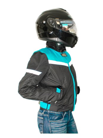 Chamarra para motociclista con protecciones suaves de EVA en hombros, codos y antebrazos. Con pretina ajustable, bolsillo interno, y dos bolsillos frontales con cierre.